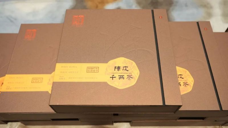 另一款新品“陳皮千兩餅”則是繼“陳皮茯茶”后又一陳皮與黑茶結(jié)合的產(chǎn)品。該產(chǎn)品采用8年陳放的傳統(tǒng)生曬的老陳皮與陳倉五年優(yōu)質(zhì)黑毛茶為原料,按照千兩茶傳統(tǒng)制作技藝踩制成型,自然晾置干燥,在藏茶倉庫內(nèi)自然陳放醇化3年后,分割成茶餅,再鋸成方格網(wǎng)狀,方便取茶泡飲。茶餅壓制緊密,陳皮塊分布均勻,茶香純正,果香濃郁持久,茶湯橙紅明亮,陳皮香與茶湯融合度高,滋味醇厚。